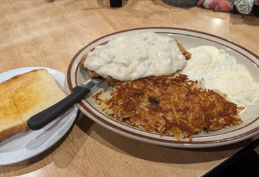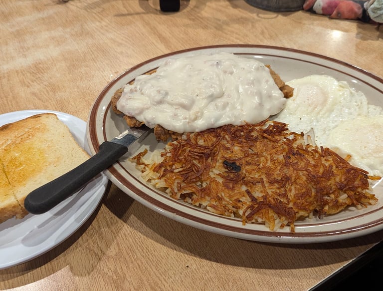 Enjoy our famous breakfast options including hand-battered chicken fried steak and classic favorites.